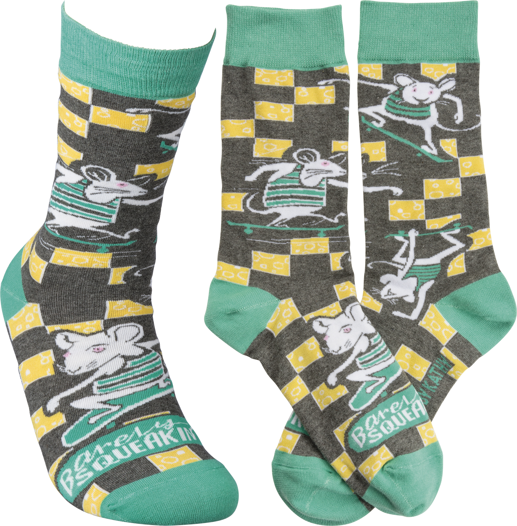 Colorfully printed socks lending a "Barely Squeakin' By" sentiment with varying skateboarding mice designs and checkered cheese background. Cotton, nylon, spandex. One size fits most.