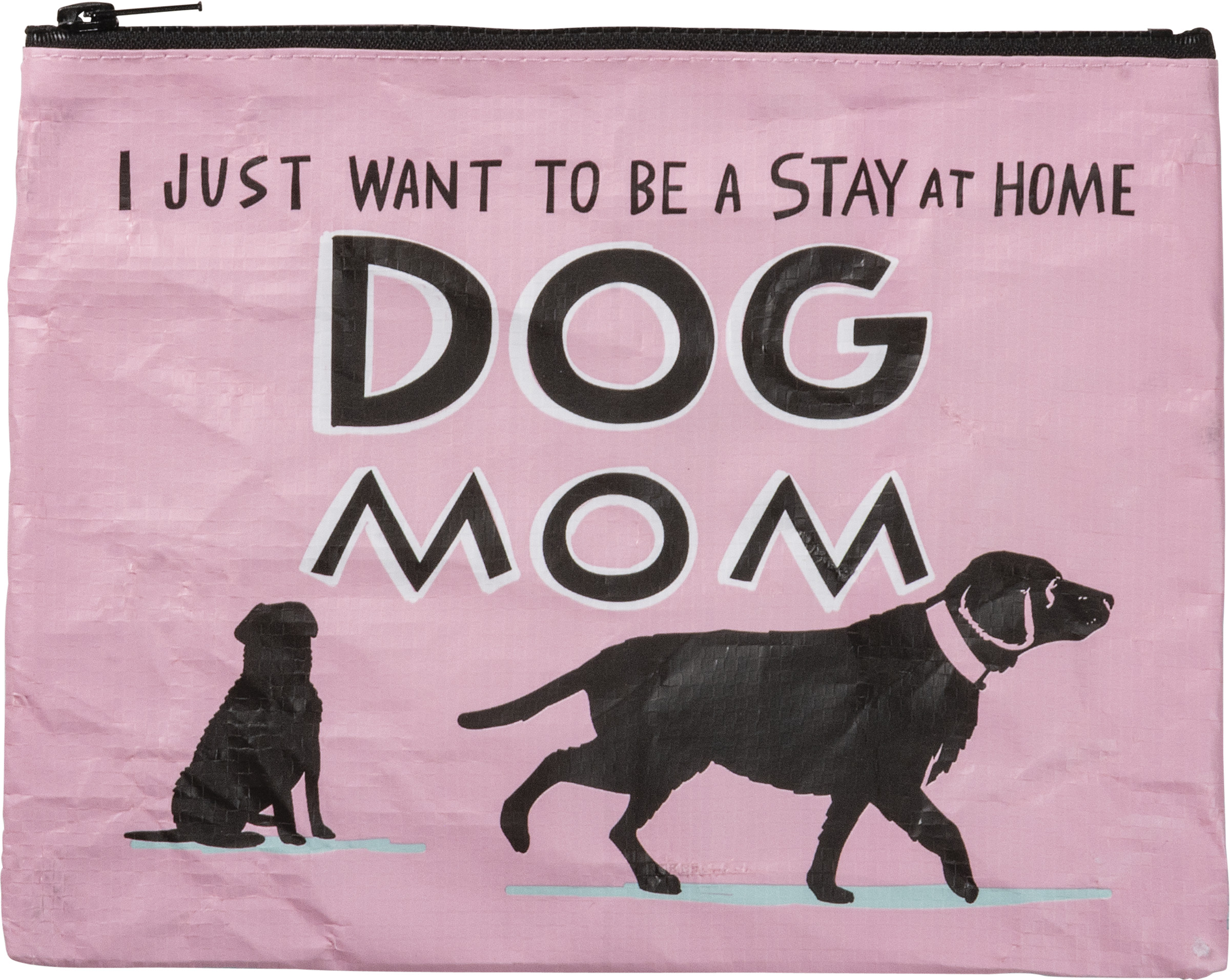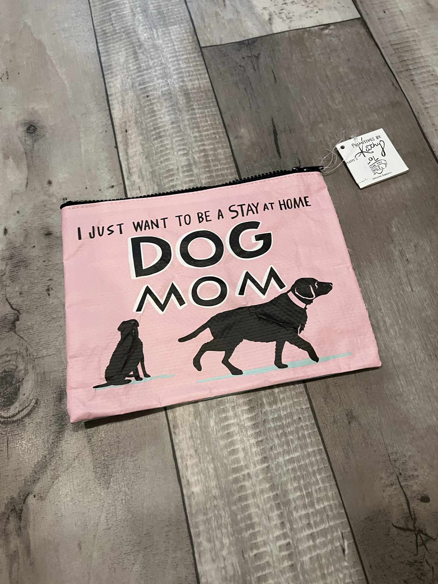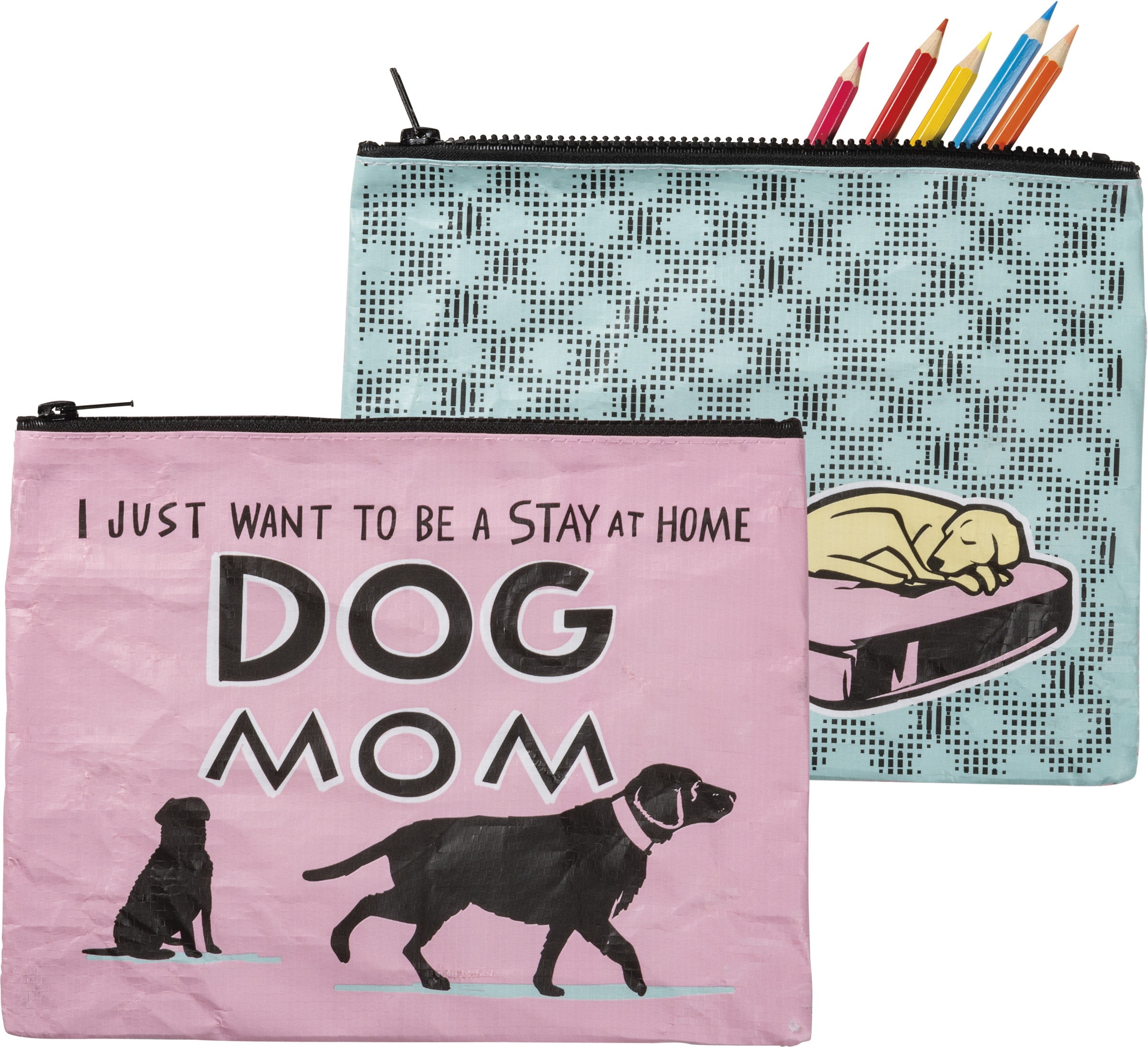 A colorful zipper pouch bag featuring a front "I Just Want To Be A Stay At Home Dog Mom" sentiment with dog designs, and reverse patterned print with dog and bed detail. Contains a top zip closure.